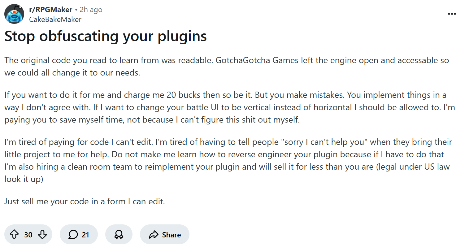 The RPG Maker community has a history of attacking successful plugin creators. It happened to Yanfly, when he decided to obfuscate his code. It happened to VisuStella, when the group stood firmly against an entitled mob that demanded unobstructed access to their trade secrets.