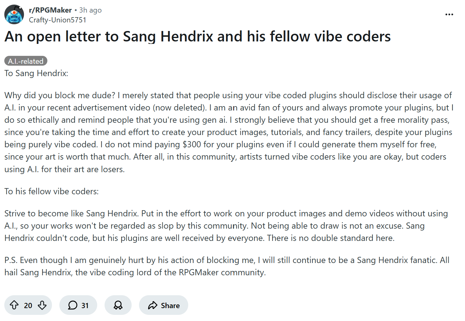 In the past 20 years, there were a lot of brilliant programmers and artists that eventually left the RPG Maker scene because the incentives to create professional-grade, quality content for RPG Maker just weren't there. Before AI existed, lots of plugin makers who tried to make cool things for RPG Maker left, lots of artists who made beautiful resources for RPG Maker left. AI didn't have anything to do with it: the community did.